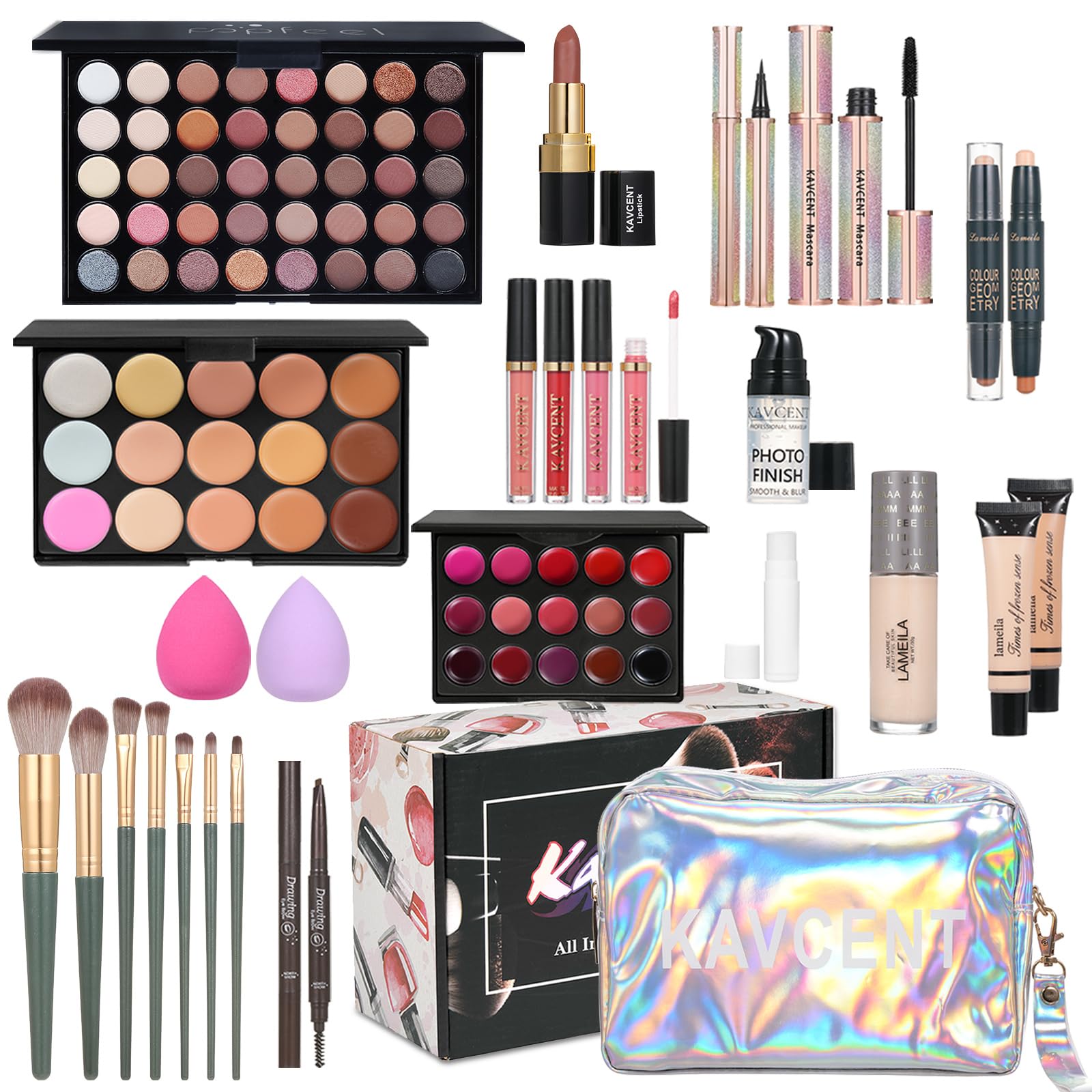 - 【All In One Makeup Kit】A perfect starter makeup kit that includes Eyeshadow Palette,Lip Gloss,Lipstick,Foundation,Concealer Palette,Mascara,Concealer,Eyebrow Pencil,Eyeliner,Contour Stick,Powder Puff,Makeup Brushes,pressed powder Palette,Cosmetic Bag. This makeup set is a great gift for any occasion