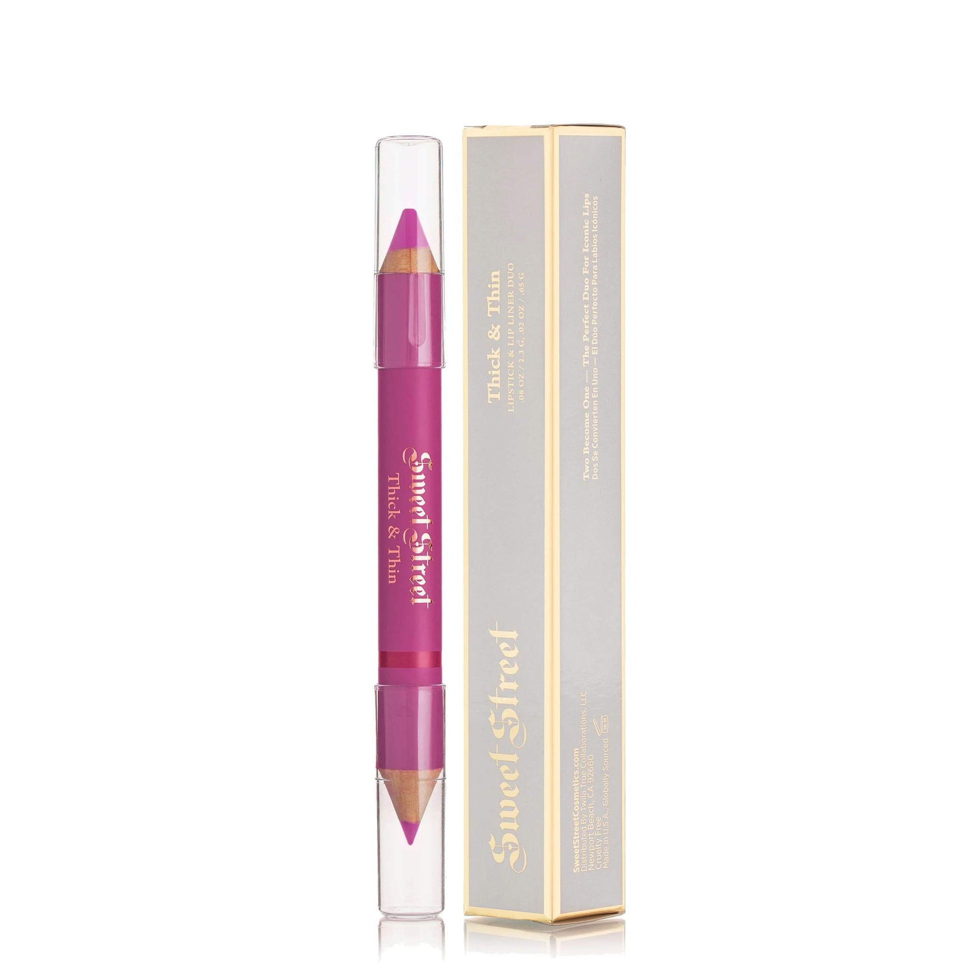 Double the depth and definition with Thick & Thin Lipstick and Liner duo. Define, enhance, and shape your lips for an intense and creamy pop of color. The thin point outlines with deep pigment and smooth precision while the thick end saturates your lips with a coordinated, satiny color. Enriched with moisture-rich Shea Butter and Vitamin E to hydrate lips while you look glam.